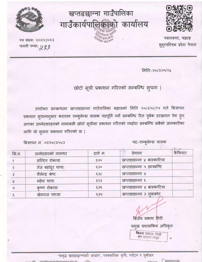 छोटो सूची प्रकाशन गरिएको सम्बन्धी सूचना
