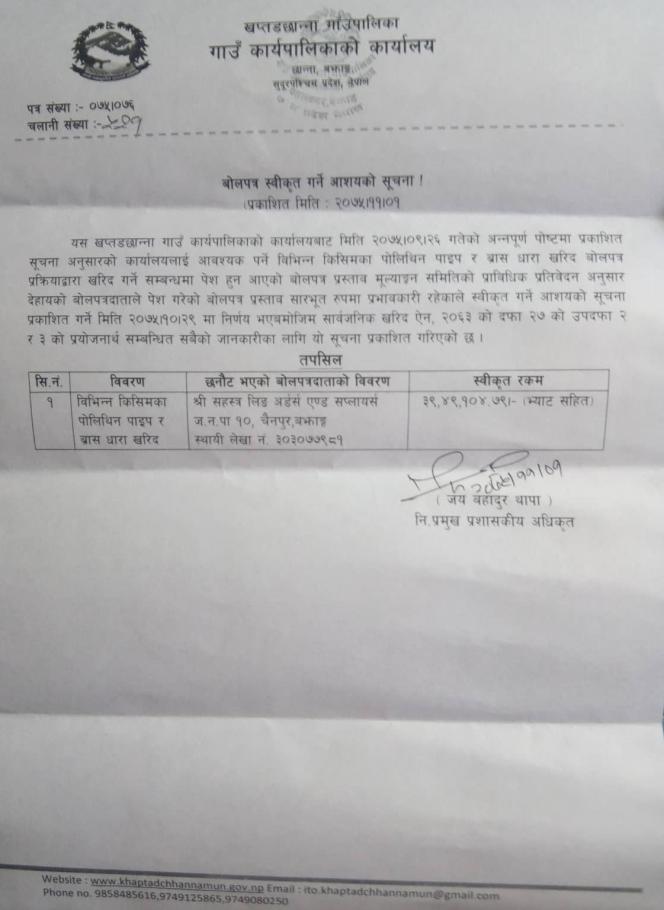 बिभिन्न किसिमका पोलिथिन पाइप र ब्रास धारा खरिद सम्बन्धि बोलपत्र स्विकृत गर्ने आसयको सुचना