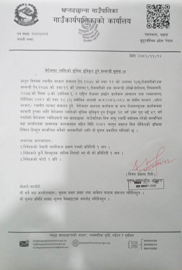 बेरोजगार व्यक्तीको सूचीमा सूचिकृत हुने सम्बन्धी सूचना