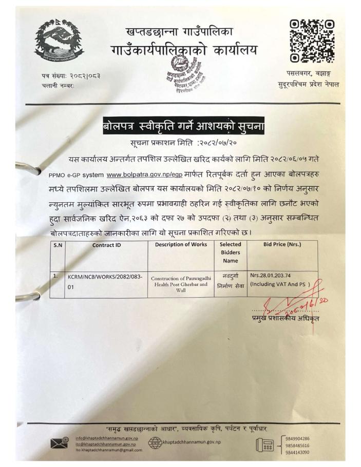 » बोलपत्र स्वीकृत गर्ने आशयको सूचना