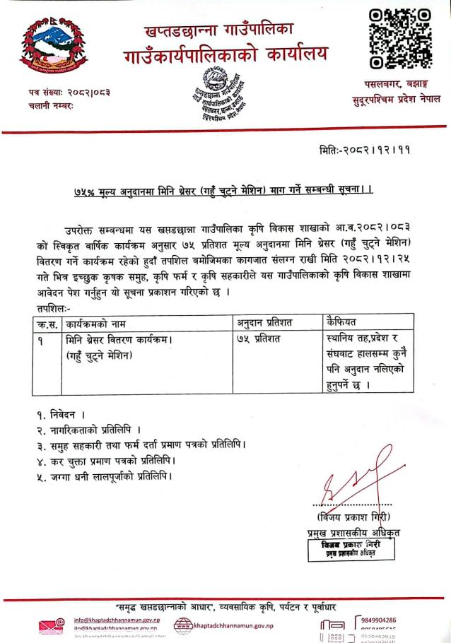 ७५% अनुदानमा गहुँ थ्रेसर माग गर्ने सम्बन्धी सूचना